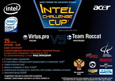 | Intel и Acer представляют уже второй в этом году шоу-матч «Intel Challenge Cup». Где? – В Питере! Когда? – 25 апреля! Во сколько? – 15:00! Что будет? – Будет невероятный матч-реванш между чемпионами России Virtus.pro и чемпионами Финляндии Team Roccat! Нас ждут не только захватывающие бои двух титанов CS, но и зрелищная дуэль капитанов, победитель которой получит прекрасный приз от компании Acer. 19-дюймовый монитор Acer P193W с 2мс отклика. И, конечно же, будет зажигательная развлекательная программа для зрителей, где любой сможет выиграть классный приз от спонсоров мероприятия. Спешите, ведь количество кресел в кинотеатре «Заневский Каскад» не так велико! Вход - свободный! Билеты вы сможете получить в самом кинотеатре на стойке администратора при входе в зрительный зал номер один. В среду и четверг с 14 до 20. В пятницу с 9 утра. Не попавшие на матч, как всегда смогут посмотреть его дома через Rambler Vision. Кстати, эта битва, по сути, будет еще являться репетицией перед финалом KODE 5, где столкнутся сильнейшие команды со всего мира.